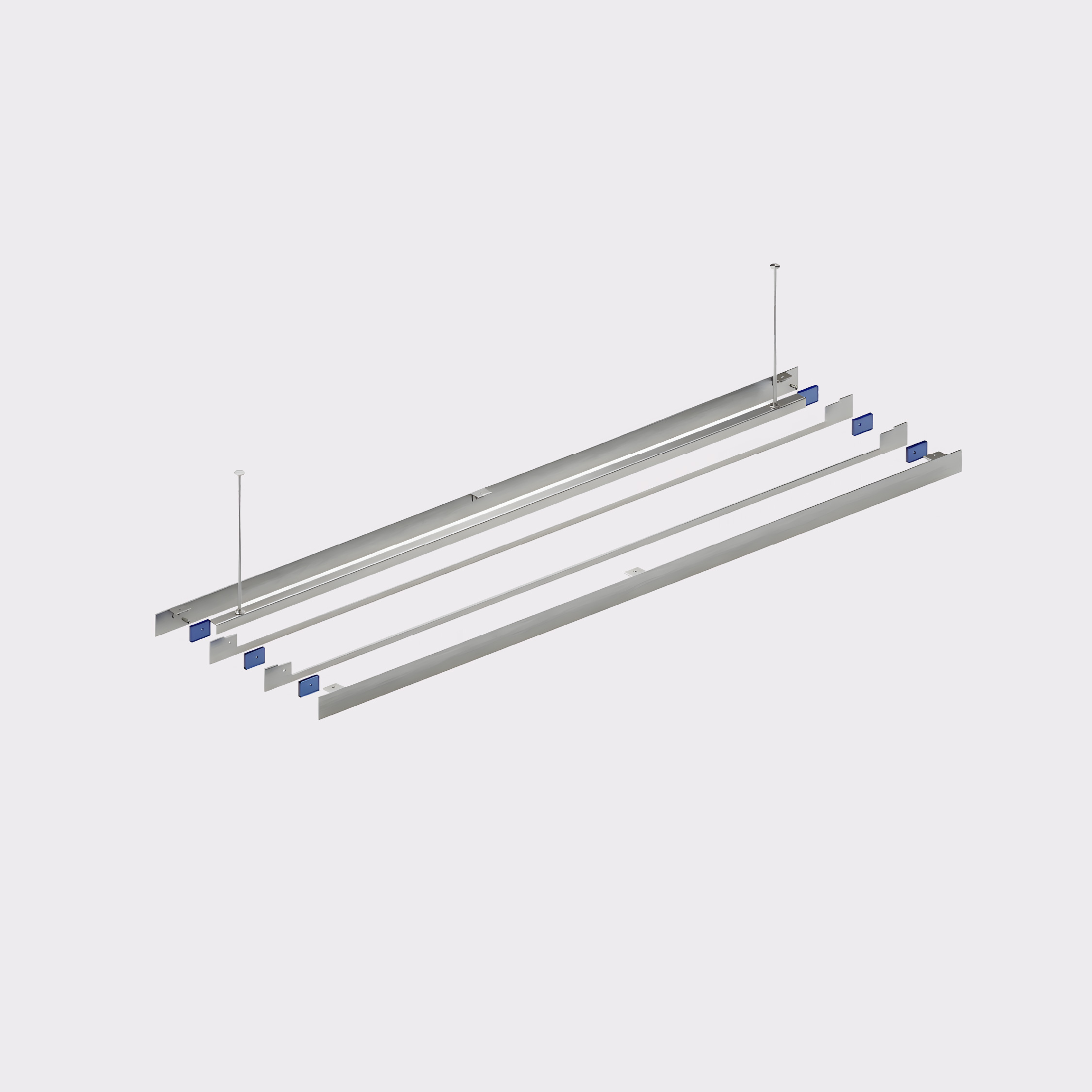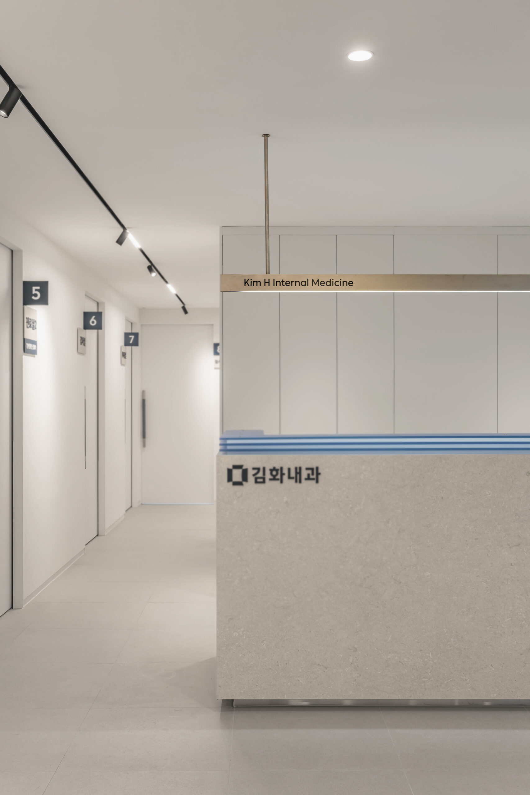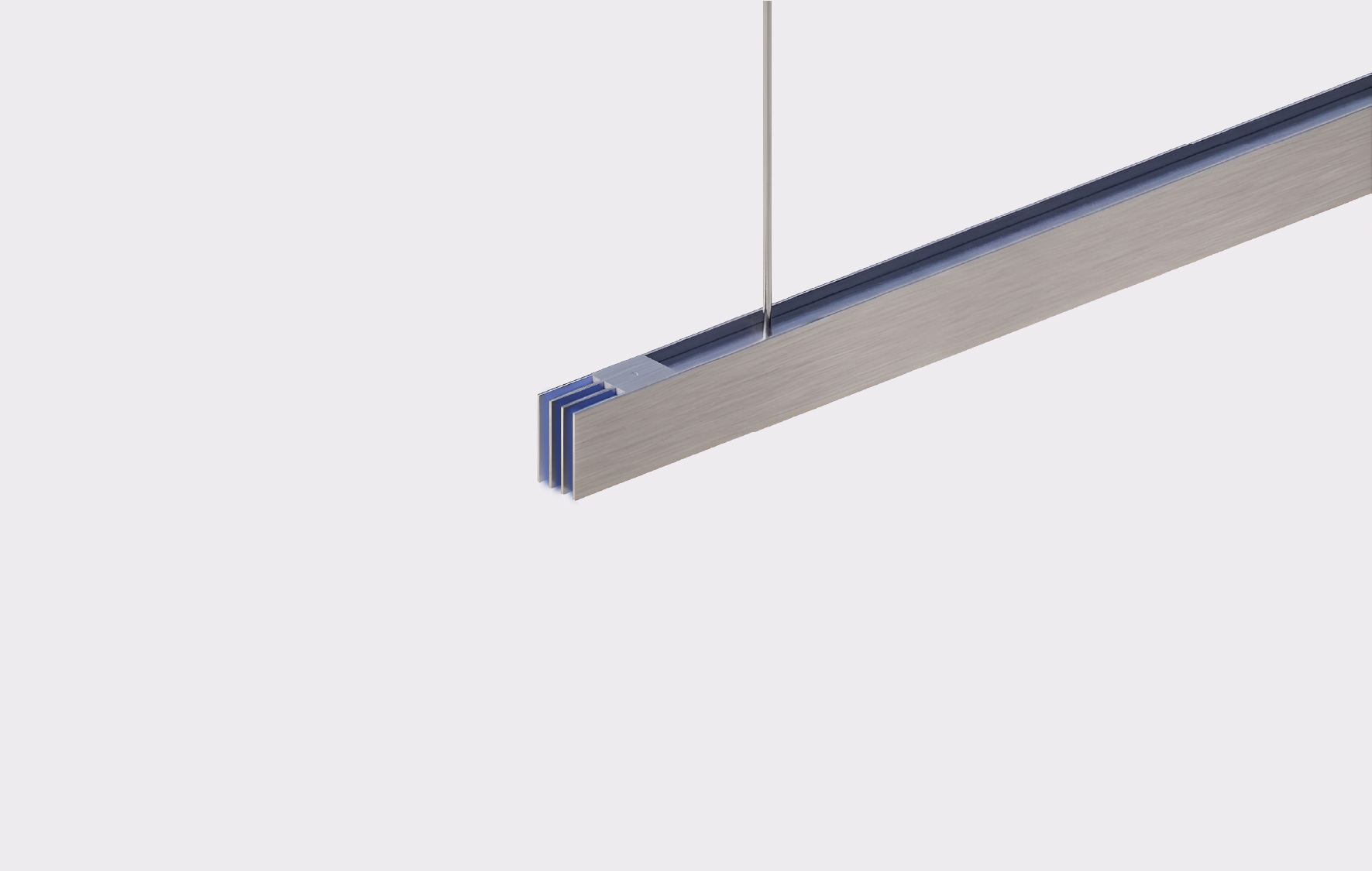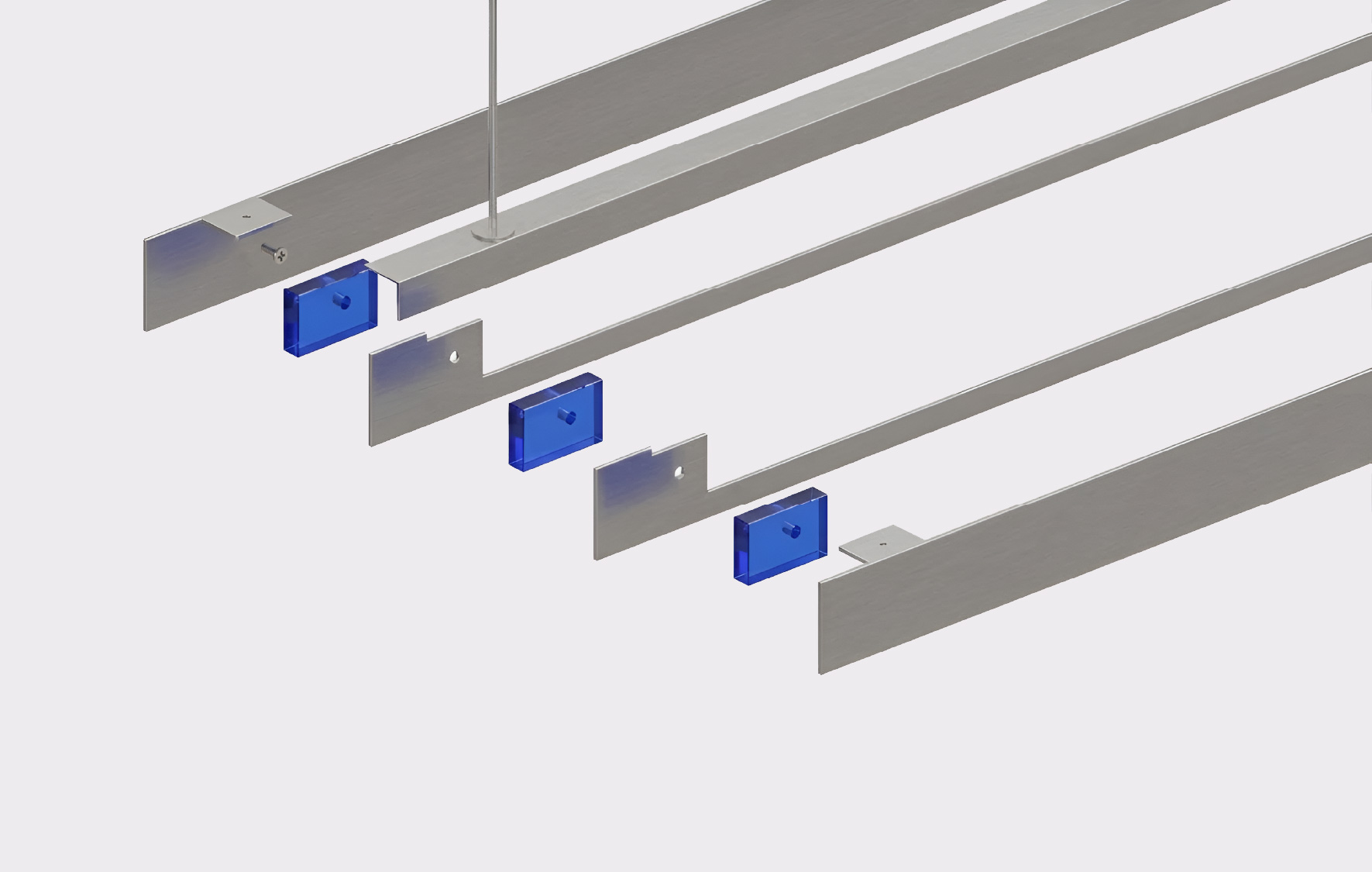 이 금속 펜던트 조명은 밝은 톤의 마감 바탕에, 블루 컬러를 포인트로 적용해 차분하면서도 신뢰감 있는 의료 공간 컨셉을 반영하여 제작하였습니다. 금속과 블루컬러의 아크릴의 조합을 통해 기능적인 요소이면서 동시에 공간의 아이덴티티를 형성하는 디자인 요소로 작용합니다. 구조는 금속 프레임 사이에 아크릴을 끼워 맞추는 방식으로 설계하여 제작과 시공을 간소화하고 유지 관리가 용이하도록 계획했습니다.