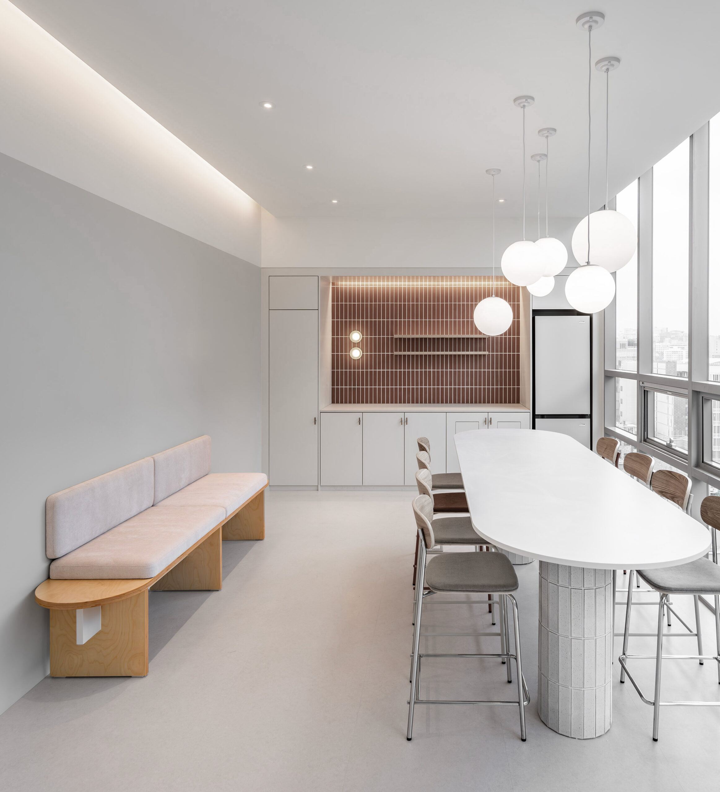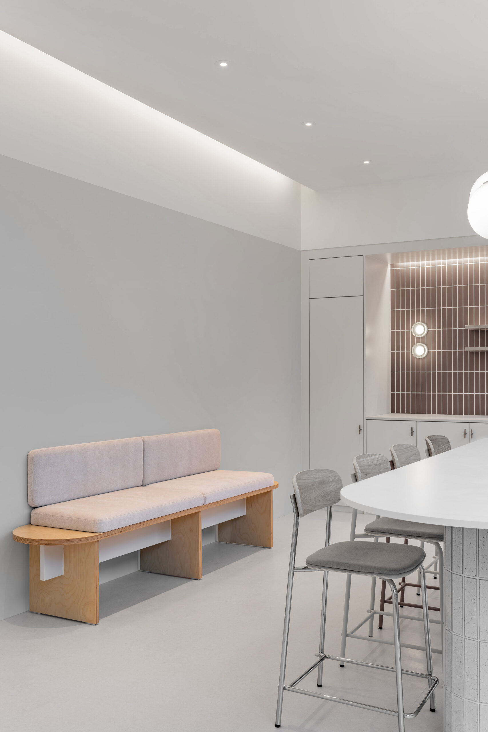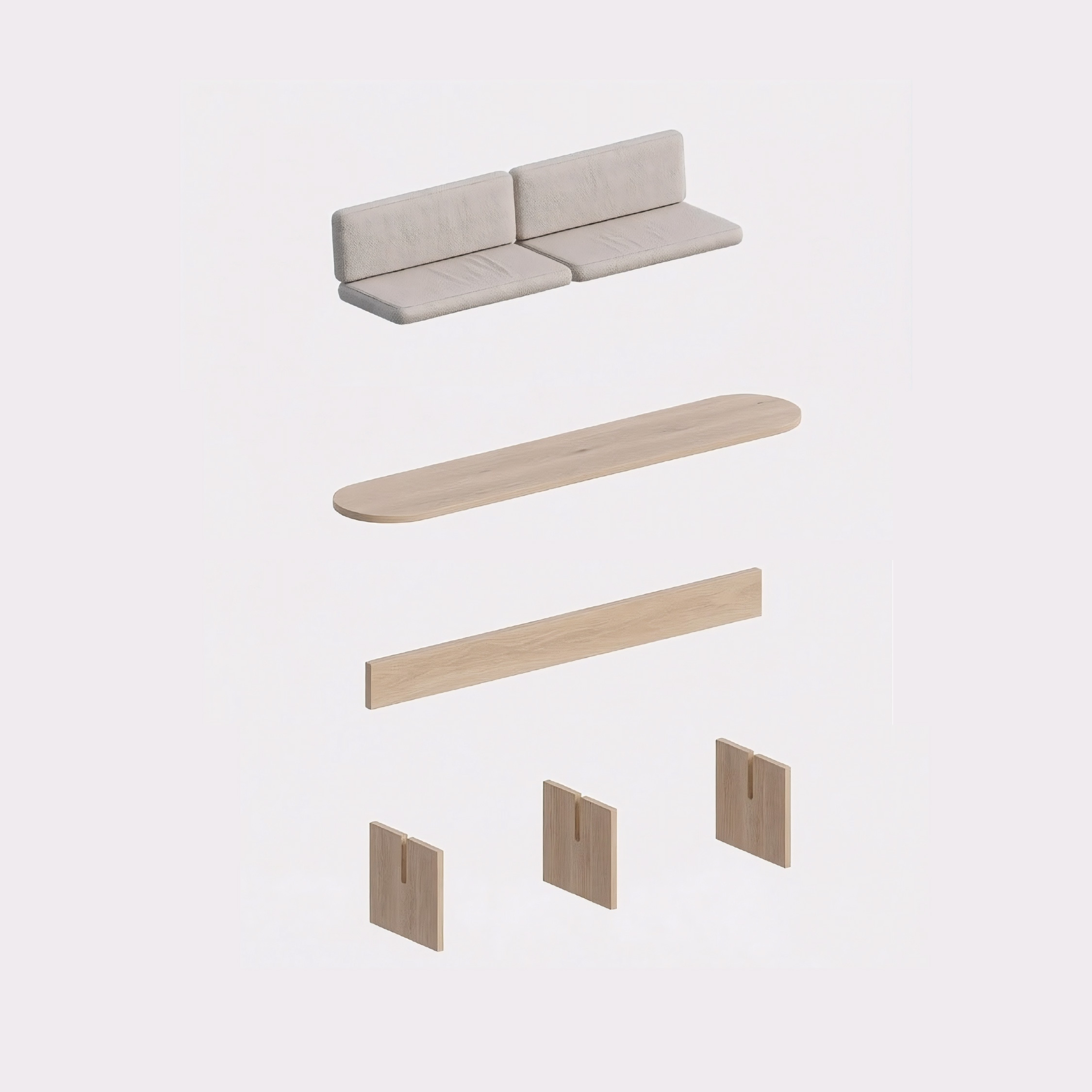 이 자작나무 벤치는 오피스 탕비실 공간에서 구성원들이 편안하게 머물며 자연스럽게 교류할 수 있도록 제작된 맞춤 가구입니다. 우드 베이스와 패브릭 등받이의 조합은 공간에 따뜻한 질감을 더하며, 벽면과 자연스럽게 연결된 형태로 계획되어 공간과 가구가 하나의 요소처럼 작용합니다.